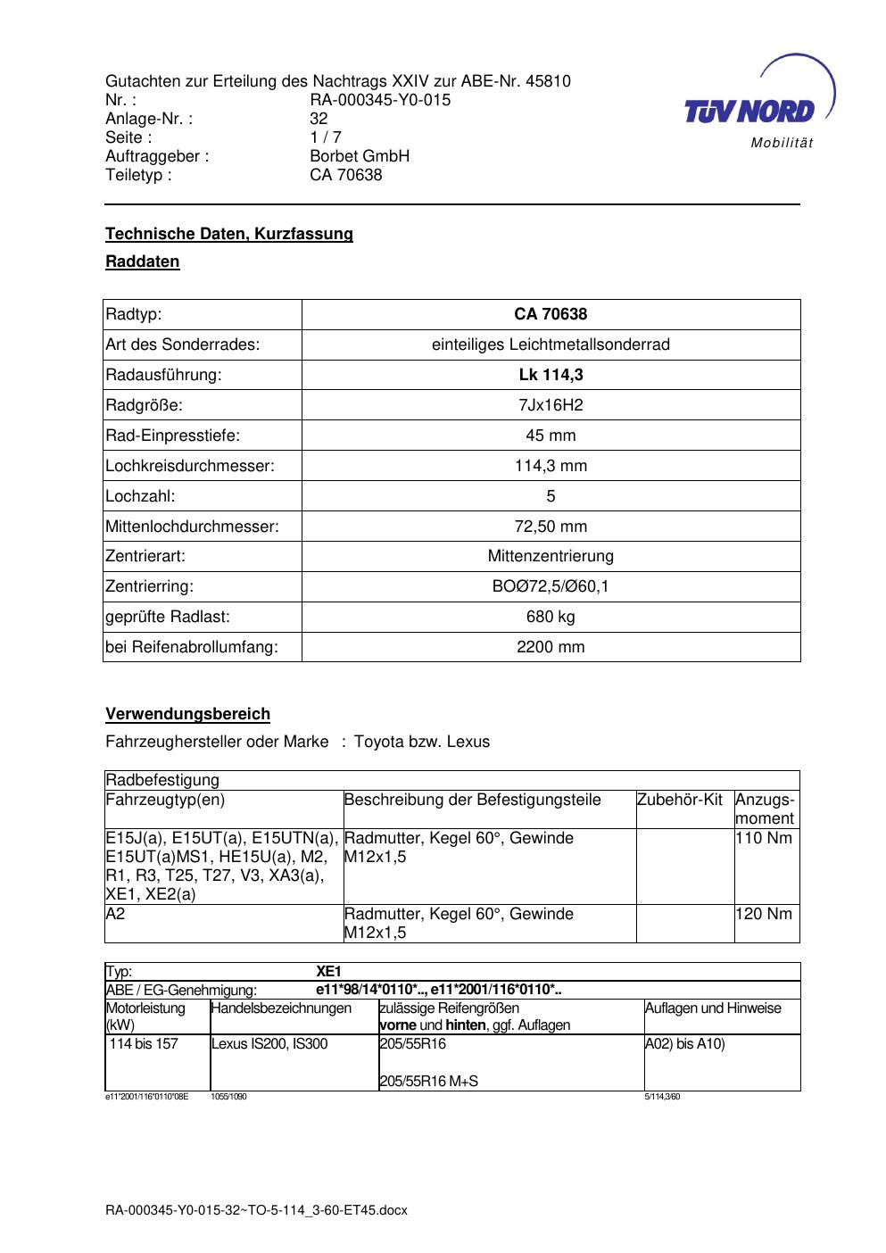 Dieses Gutachten (abe) bezieht sich auf die Alufelge Borbet CA 70638 in der Ausführung 7Jx16 ET 0, Mittenloch 0 mm (KBA 45810). Im PDF findest du typischerweise zulässige Reifengrößen, Auflagen/Anbauhinweise und – je nach Dokument – Hinweise zur Eintragung.