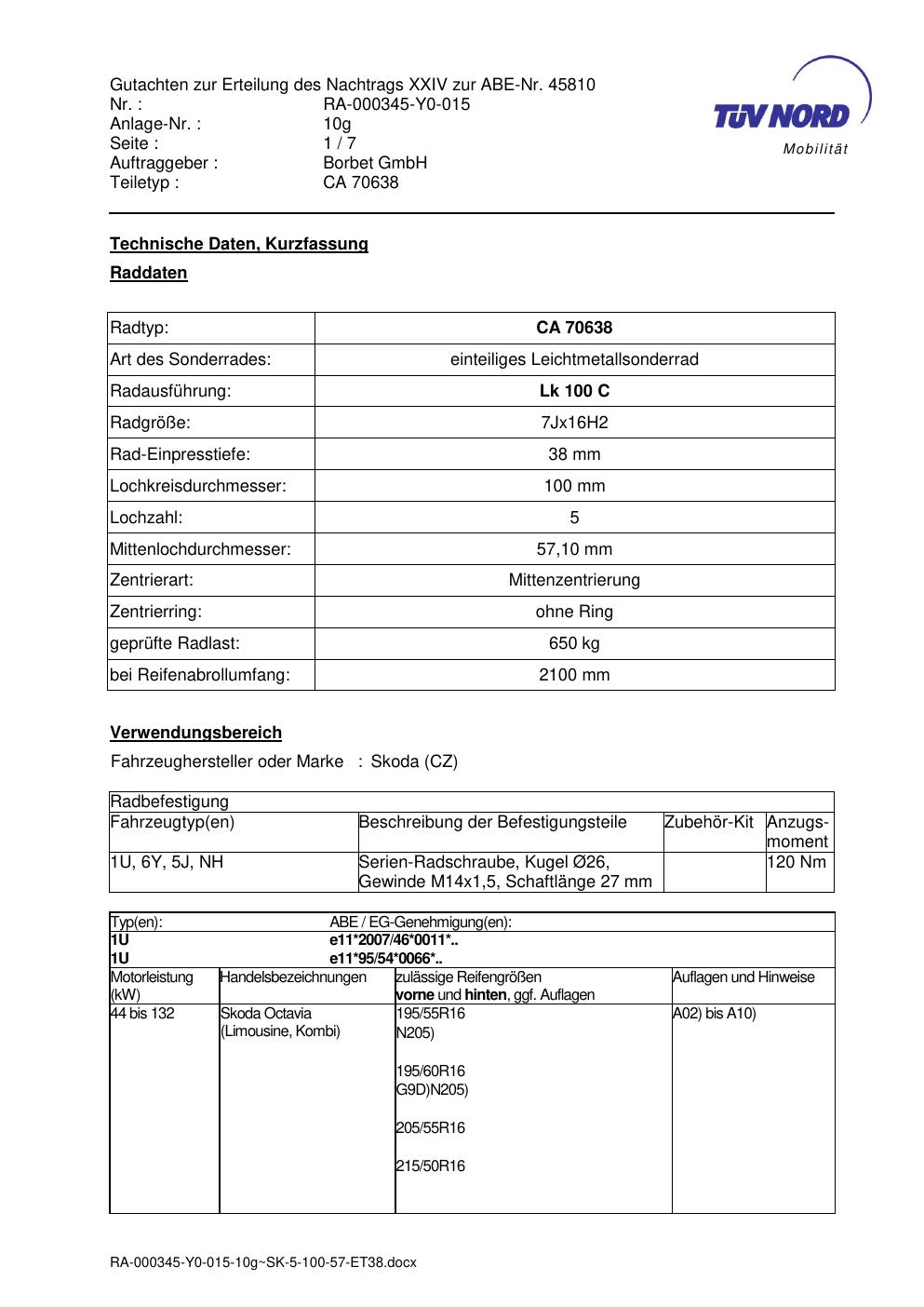 Dieses Gutachten (abe) bezieht sich auf die Alufelge Borbet CA 70638 in der Ausführung 7Jx16 ET 0, Mittenloch 0 mm (KBA 45810). Im PDF findest du typischerweise zulässige Reifengrößen, Auflagen/Anbauhinweise und – je nach Dokument – Hinweise zur Eintragung.