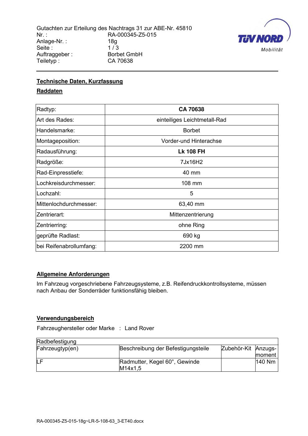 Dieses Gutachten (abe) bezieht sich auf die Alufelge Borbet CA 70638 in der Ausführung 7Jx16 ET 0, Mittenloch 0 mm (KBA 45810). Im PDF findest du typischerweise zulässige Reifengrößen, Auflagen/Anbauhinweise und – je nach Dokument – Hinweise zur Eintragung.
