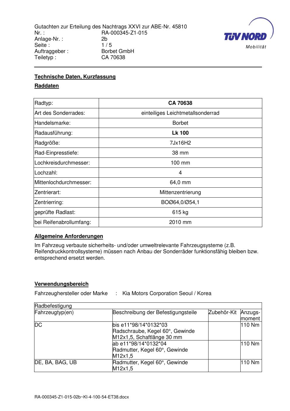 Dieses Gutachten (abe) bezieht sich auf die Alufelge Borbet CA 70638 in der Ausführung 7Jx16 ET 0, Mittenloch 0 mm (KBA 45810). Im PDF findest du typischerweise zulässige Reifengrößen, Auflagen/Anbauhinweise und – je nach Dokument – Hinweise zur Eintragung.
