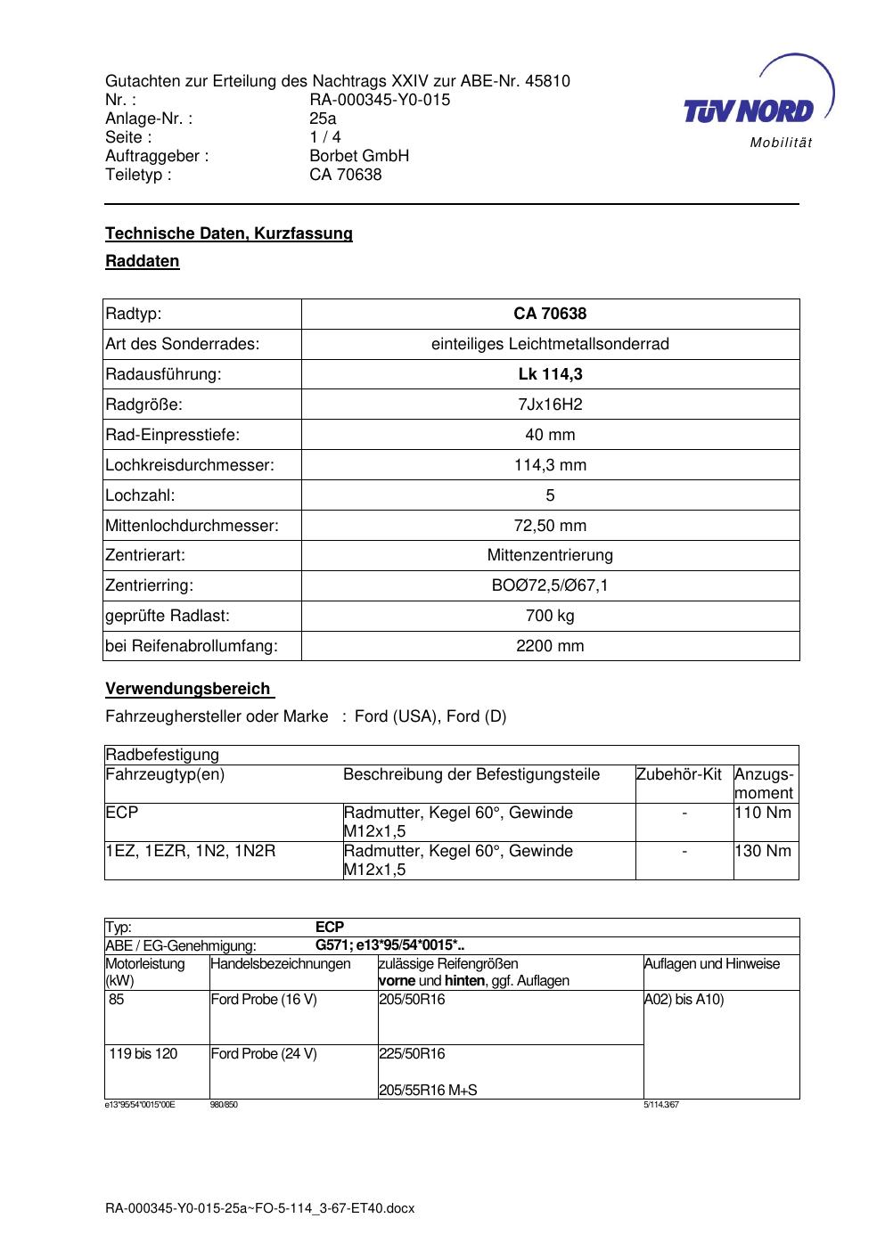 Dieses Gutachten (abe) bezieht sich auf die Alufelge Borbet CA 70638 in der Ausführung 7Jx16 ET 0, Mittenloch 0 mm (KBA 45810). Im PDF findest du typischerweise zulässige Reifengrößen, Auflagen/Anbauhinweise und – je nach Dokument – Hinweise zur Eintragung.