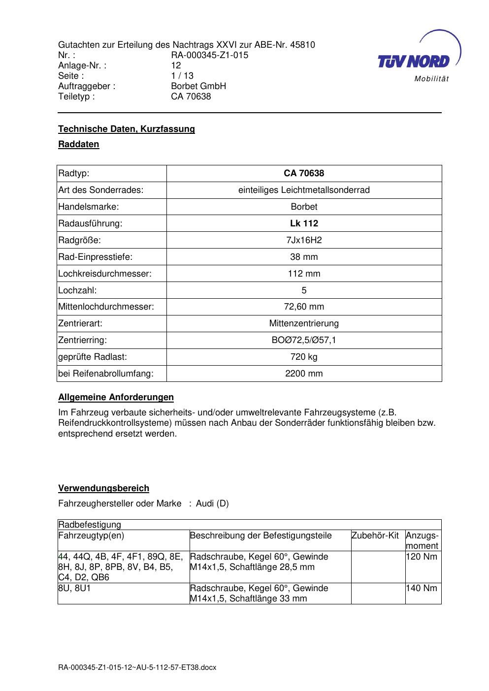 Dieses Gutachten (abe) bezieht sich auf die Alufelge Borbet CA 70638 in der Ausführung 7Jx16 ET 0, Mittenloch 0 mm (KBA 45810). Im PDF findest du typischerweise zulässige Reifengrößen, Auflagen/Anbauhinweise und – je nach Dokument – Hinweise zur Eintragung.