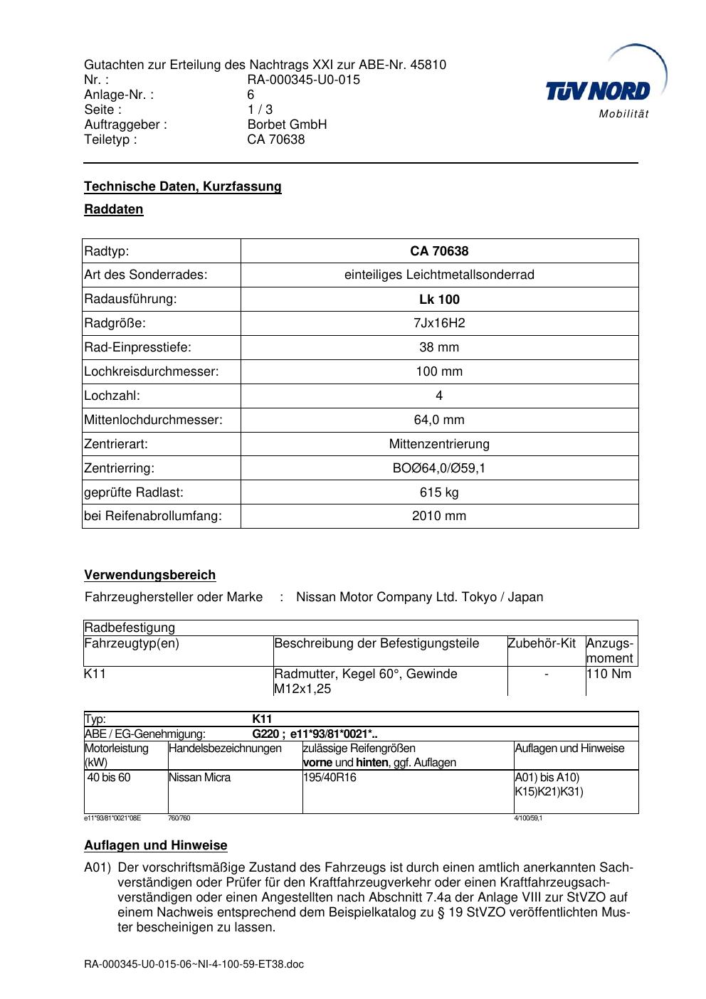 • Stimmt die KBA-Nummer auf der Felge mit diesem Dokument überein?