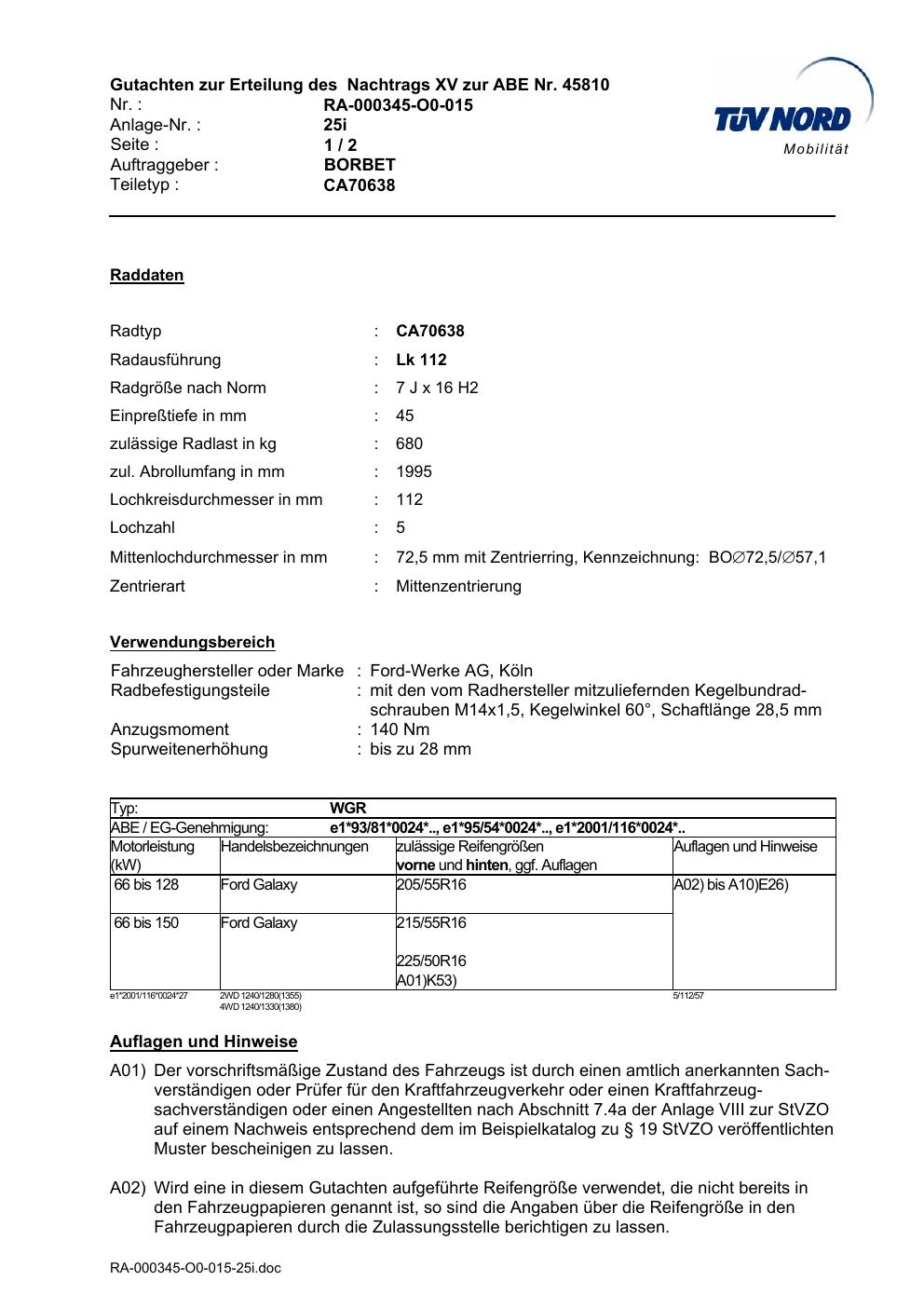 Dieses Gutachten (abe) bezieht sich auf die Alufelge brand-borbet CA70638 in der Ausführung 7Jx16 ET 0, Mittenloch 0 mm (KBA 45810). Im PDF findest du typischerweise zulässige Reifengrößen, Auflagen/Anbauhinweise und – je nach Dokument – Hinweise zur Eintragung.