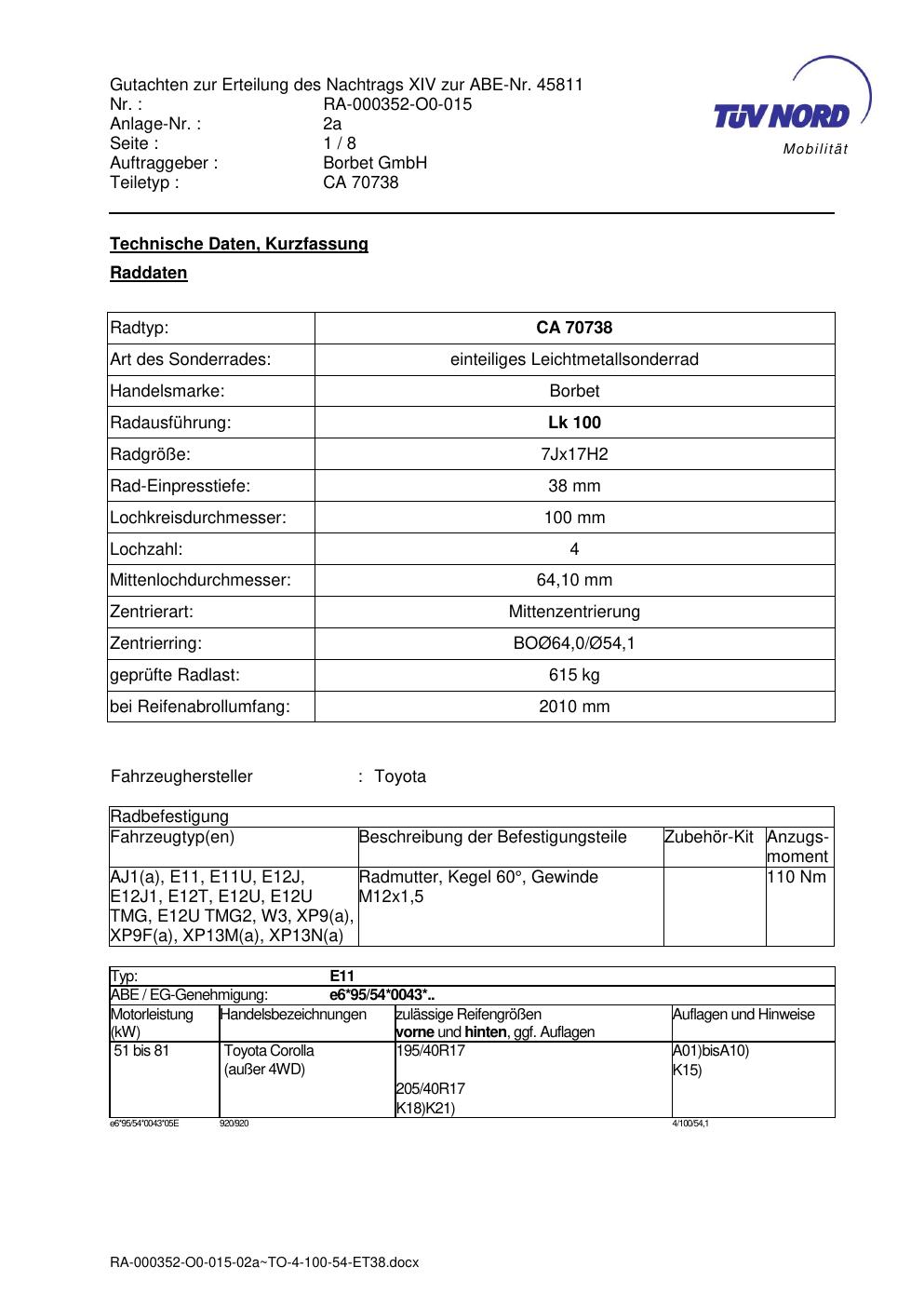 Dieses Gutachten (abe) bezieht sich auf die Alufelge ATS CA 70738 in der Ausführung 7Jx17 ET 0, Mittenloch 0 mm (KBA 45811). Im PDF findest du typischerweise zulässige Reifengrößen, Auflagen/Anbauhinweise und – je nach Dokument – Hinweise zur Eintragung.