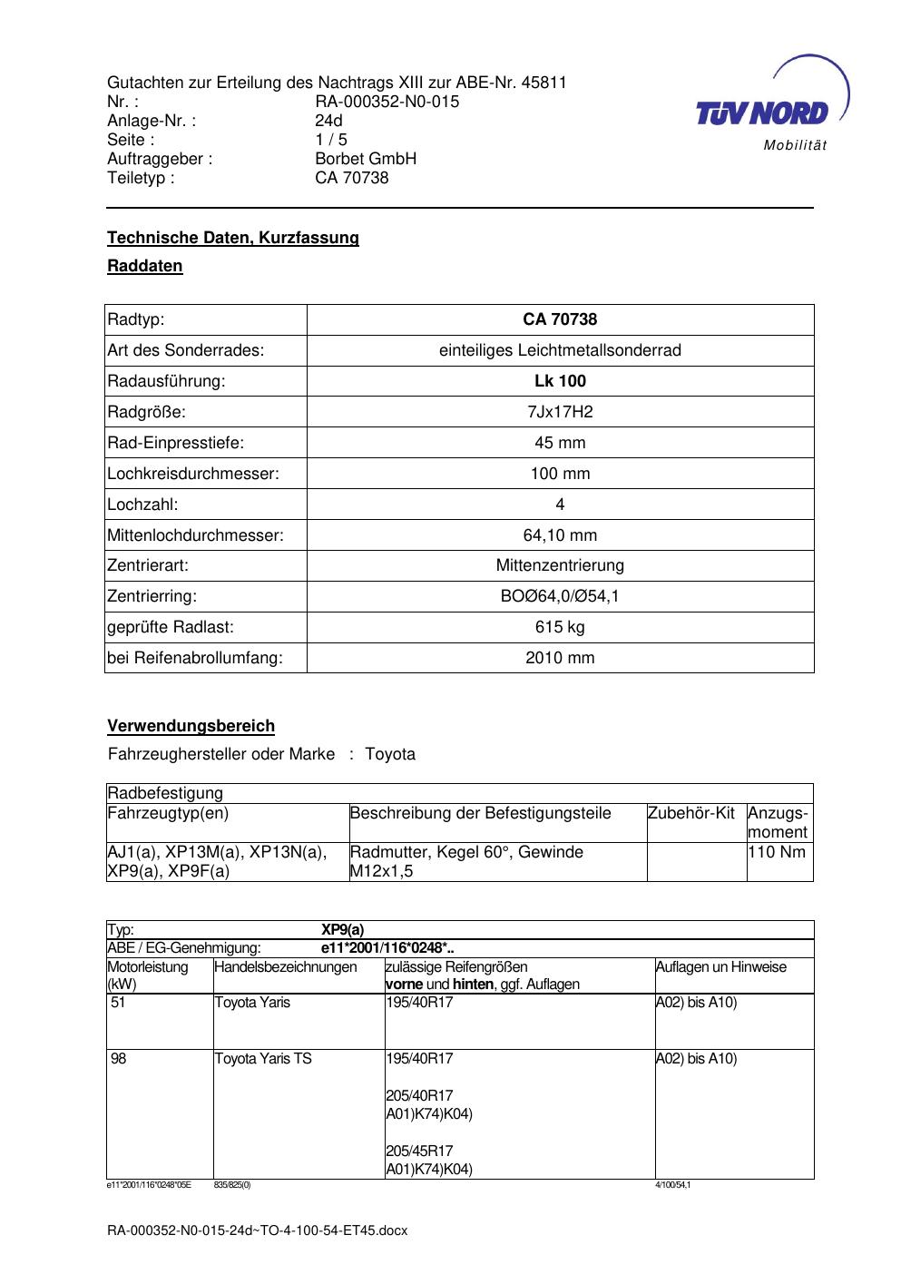 Dieses Gutachten (abe) bezieht sich auf die Alufelge ATS CA 70738 in der Ausführung 7Jx17 ET 0, Mittenloch 0 mm (KBA 45811). Im PDF findest du typischerweise zulässige Reifengrößen, Auflagen/Anbauhinweise und – je nach Dokument – Hinweise zur Eintragung.