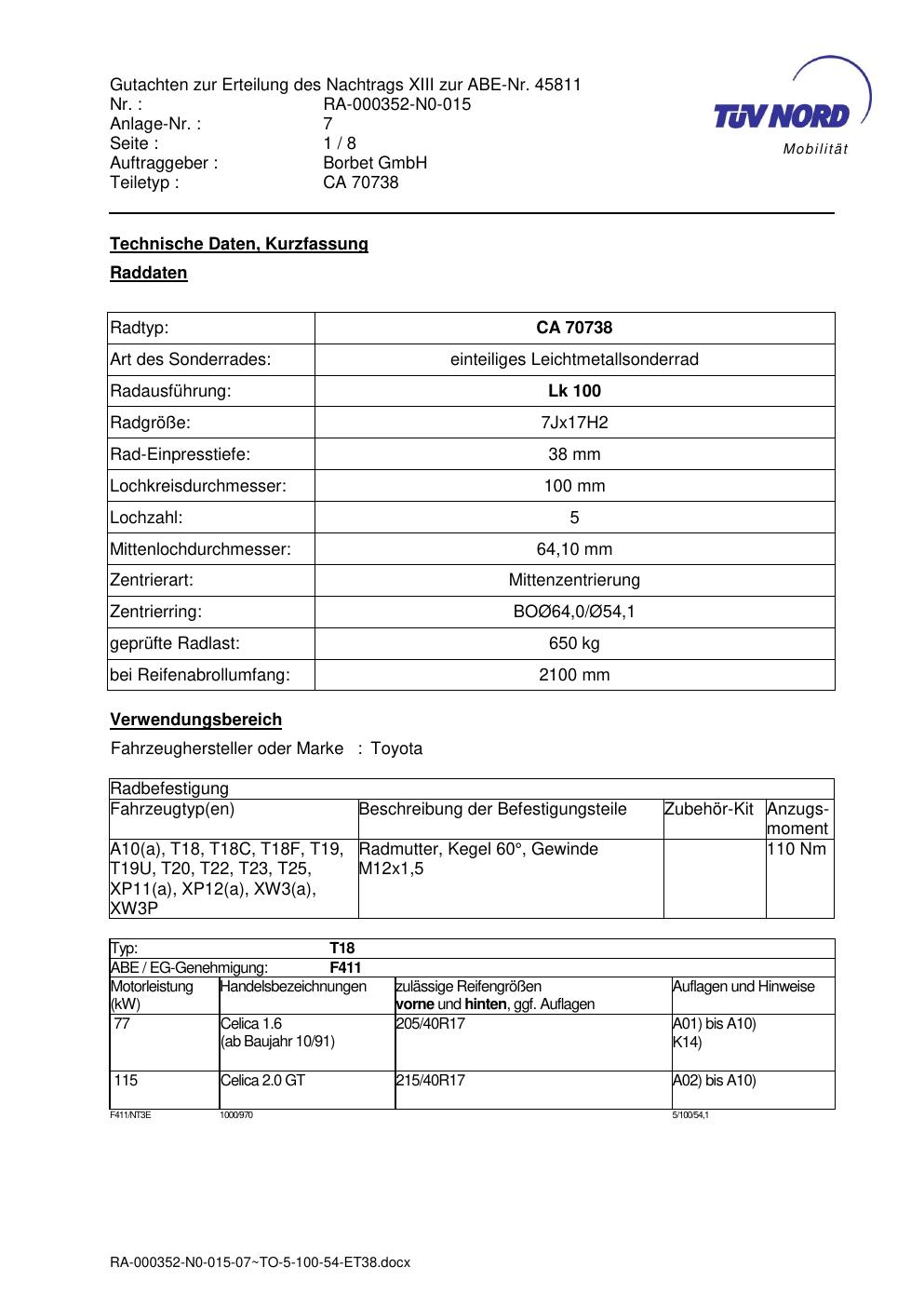 Dieses Gutachten (abe) bezieht sich auf die Alufelge Borbet CA 70738 in der Ausführung 7Jx17 ET 0, Mittenloch 0 mm (KBA 45811). Im PDF findest du typischerweise zulässige Reifengrößen, Auflagen/Anbauhinweise und – je nach Dokument – Hinweise zur Eintragung.