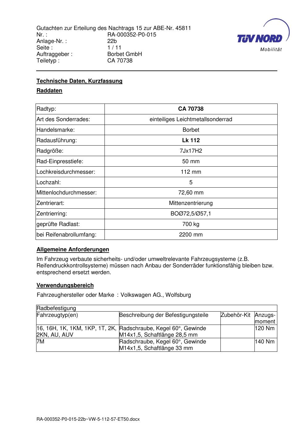 Dieses Gutachten (abe) bezieht sich auf die Alufelge Borbet CA 70738 in der Ausführung 7Jx17 ET 0, Mittenloch 0 mm (KBA 45811). Im PDF findest du typischerweise zulässige Reifengrößen, Auflagen/Anbauhinweise und – je nach Dokument – Hinweise zur Eintragung.