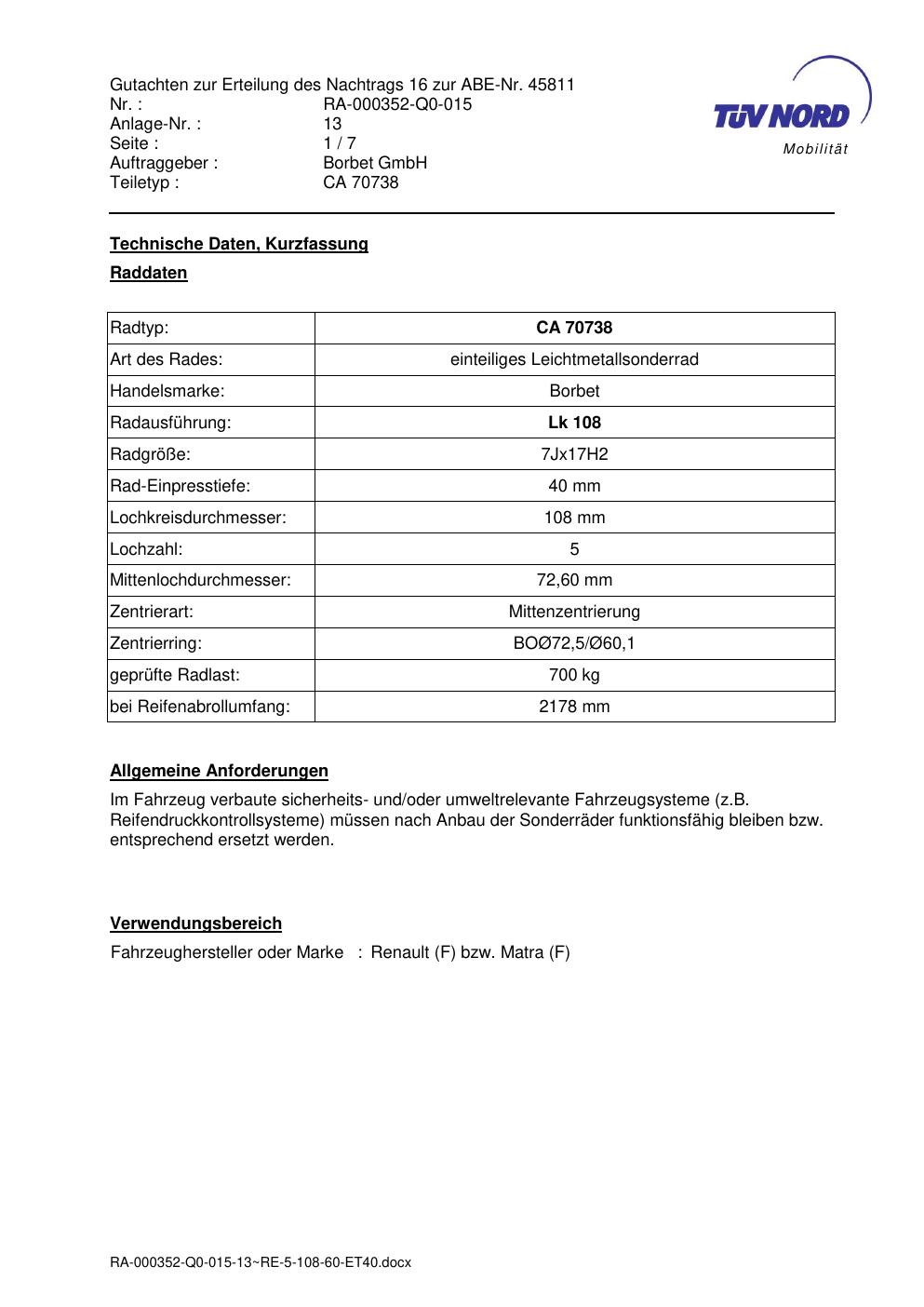 Dieses Gutachten (abe) bezieht sich auf die Alufelge Borbet CA 70738 in der Ausführung 7Jx17 ET 0, Mittenloch 0 mm (KBA 45811). Im PDF findest du typischerweise zulässige Reifengrößen, Auflagen/Anbauhinweise und – je nach Dokument – Hinweise zur Eintragung.