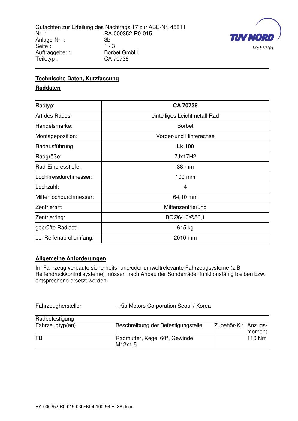 Dieses Gutachten (abe) bezieht sich auf die Alufelge Borbet CA 70738 in der Ausführung 7Jx17 ET 0, Mittenloch 0 mm (KBA 45811). Im PDF findest du typischerweise zulässige Reifengrößen, Auflagen/Anbauhinweise und – je nach Dokument – Hinweise zur Eintragung.
