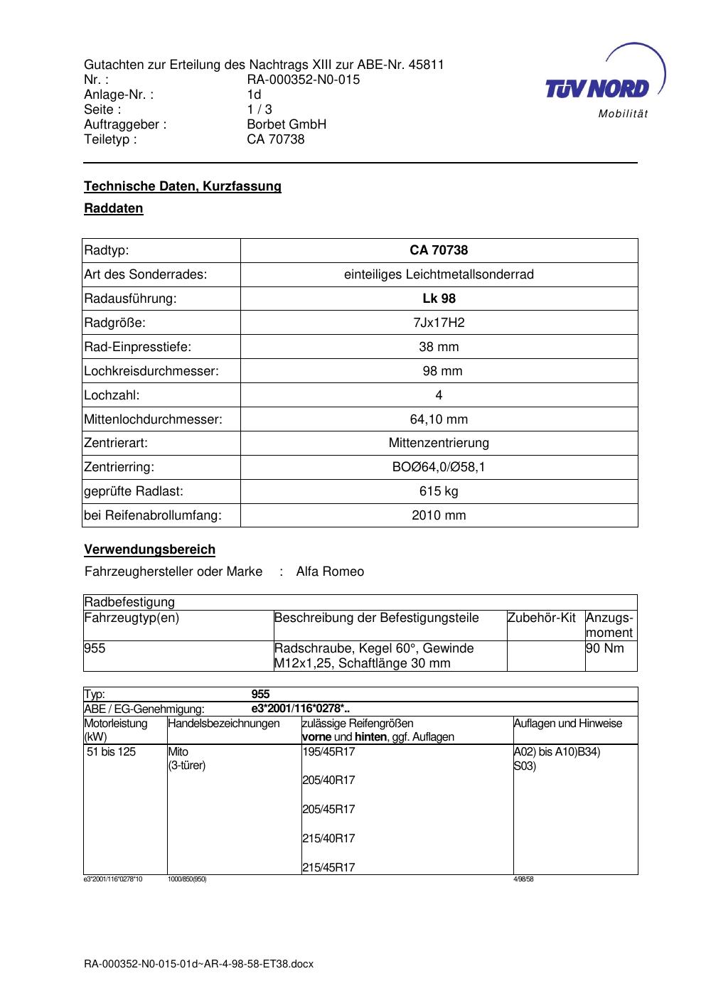 Dieses Gutachten (abe) bezieht sich auf die Alufelge Borbet CA 70738 in der Ausführung 7Jx17 ET 0, Mittenloch 0 mm (KBA 45811). Im PDF findest du typischerweise zulässige Reifengrößen, Auflagen/Anbauhinweise und – je nach Dokument – Hinweise zur Eintragung.
