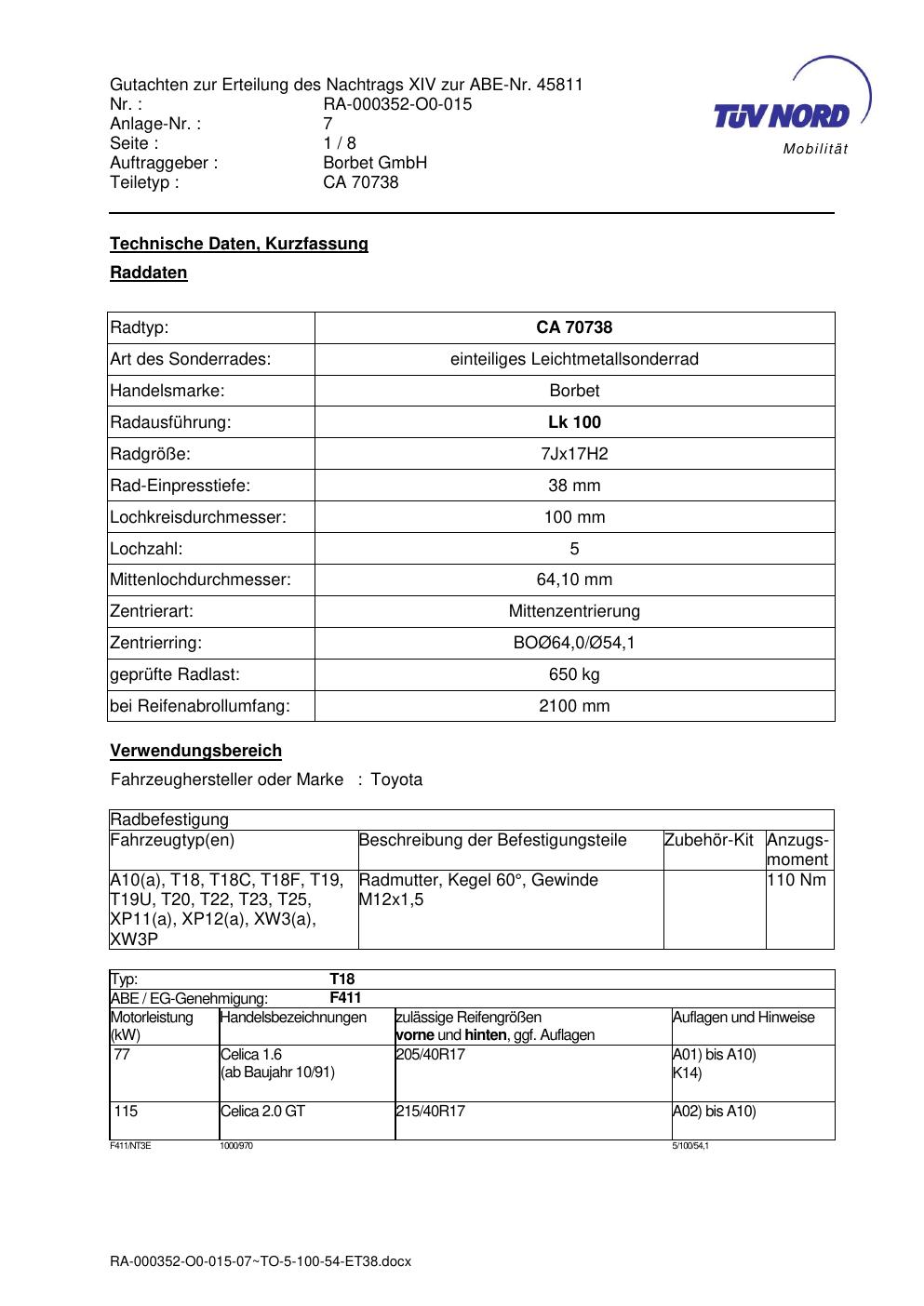 Dieses Gutachten (abe) bezieht sich auf die Alufelge Borbet CA 70738 in der Ausführung 7Jx17 ET 0, Mittenloch 0 mm (KBA 45811). Im PDF findest du typischerweise zulässige Reifengrößen, Auflagen/Anbauhinweise und – je nach Dokument – Hinweise zur Eintragung.