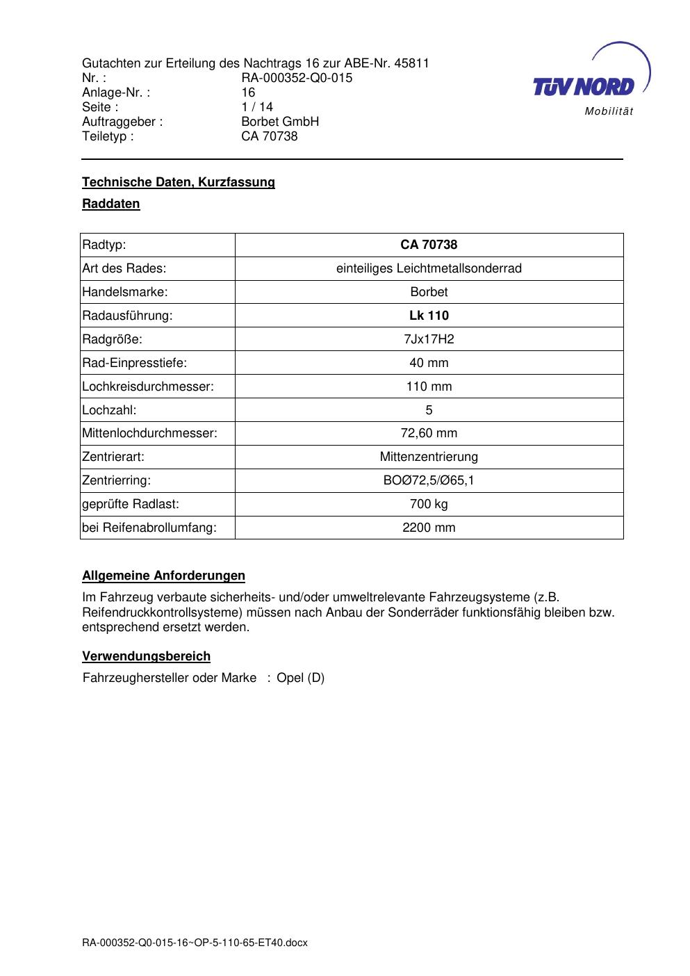 Dieses Gutachten (abe) bezieht sich auf die Alufelge Borbet CA 70738 in der Ausführung 7Jx17 ET 0, Mittenloch 0 mm (KBA 45811). Im PDF findest du typischerweise zulässige Reifengrößen, Auflagen/Anbauhinweise und – je nach Dokument – Hinweise zur Eintragung.