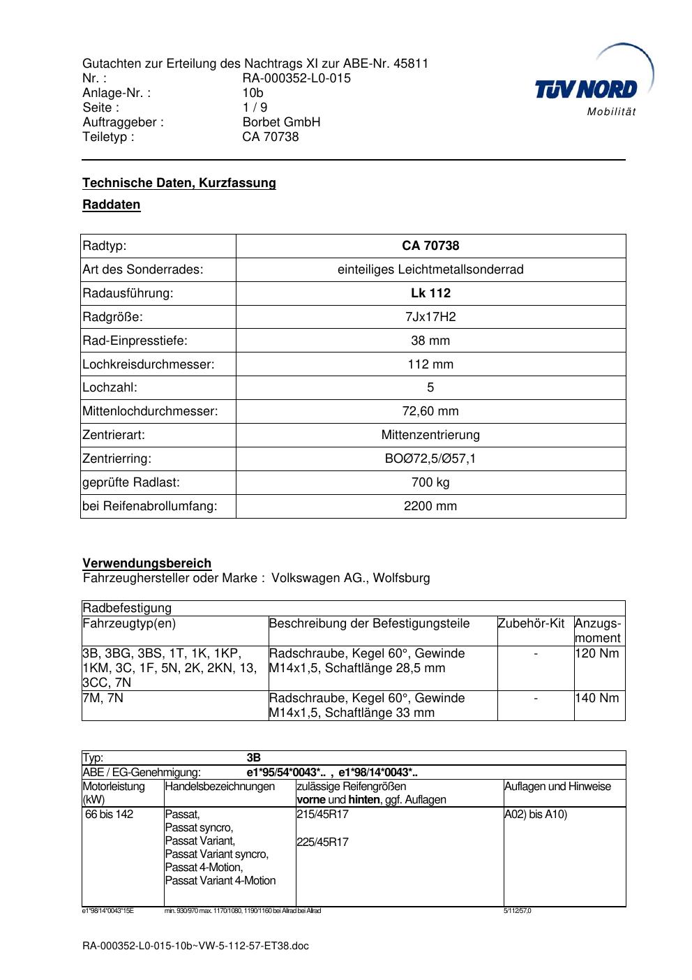 Dieses Gutachten (abe) bezieht sich auf die Alufelge Borbet CA 70738 in der Ausführung 7Jx17 ET 0, Mittenloch 0 mm (KBA 45811). Im PDF findest du typischerweise zulässige Reifengrößen, Auflagen/Anbauhinweise und – je nach Dokument – Hinweise zur Eintragung.