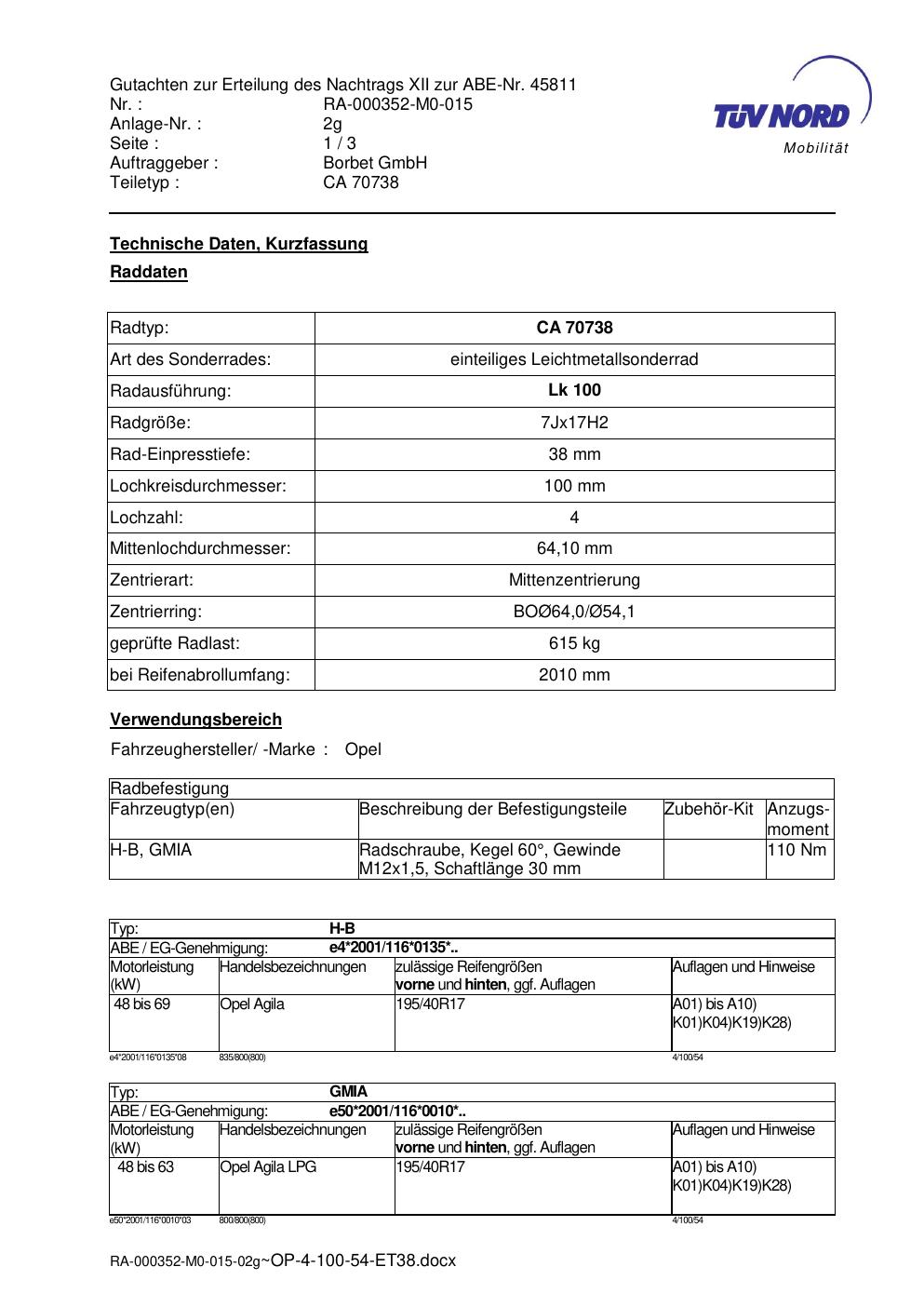 Dieses Gutachten (abe) bezieht sich auf die Alufelge Borbet CA 70738 in der Ausführung 7Jx17 ET 0, Mittenloch 0 mm (KBA 45811). Im PDF findest du typischerweise zulässige Reifengrößen, Auflagen/Anbauhinweise und – je nach Dokument – Hinweise zur Eintragung.
