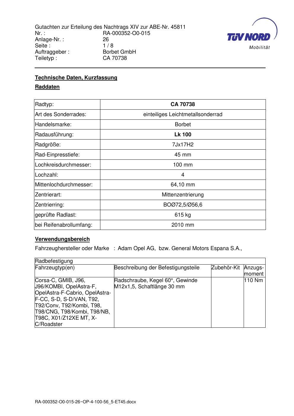 Dieses Gutachten (abe) bezieht sich auf die Alufelge Borbet CA 70738 in der Ausführung 7Jx17 ET 0, Mittenloch 0 mm (KBA 45811). Im PDF findest du typischerweise zulässige Reifengrößen, Auflagen/Anbauhinweise und – je nach Dokument – Hinweise zur Eintragung.