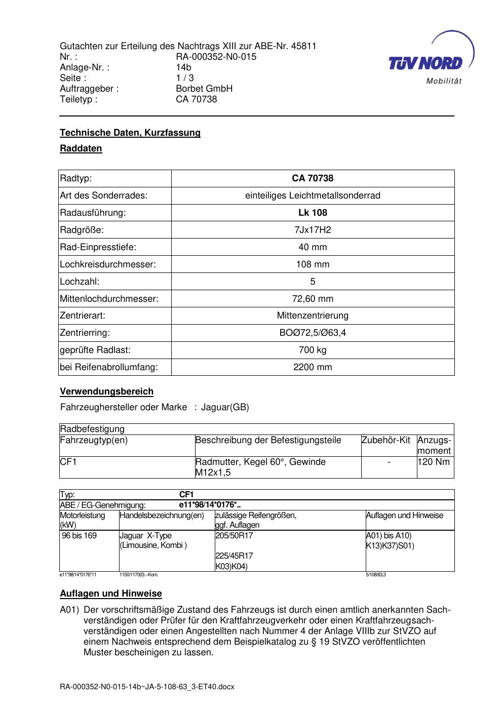 Dieses Gutachten (abe) bezieht sich auf die Alufelge Borbet CA 70738 in der Ausführung 7Jx17 ET 0, Mittenloch 0 mm (KBA 45811). Im PDF findest du typischerweise zulässige Reifengrößen, Auflagen/Anbauhinweise und – je nach Dokument – Hinweise zur Eintragung.