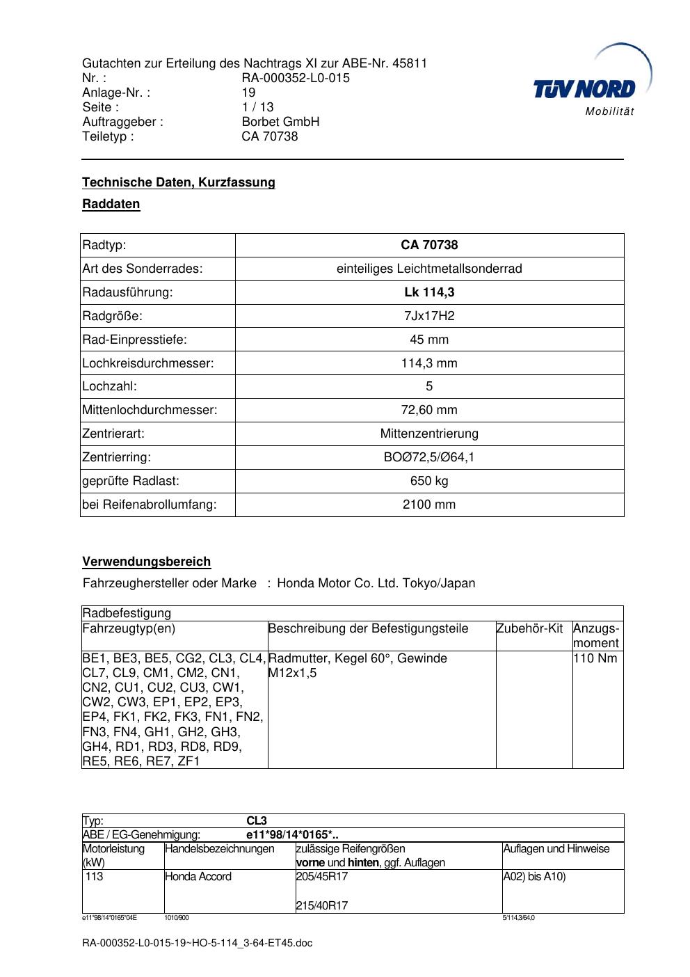 Dieses Gutachten (abe) bezieht sich auf die Alufelge Borbet CA 70738 in der Ausführung 7Jx17 ET 0, Mittenloch 0 mm (KBA 45811). Im PDF findest du typischerweise zulässige Reifengrößen, Auflagen/Anbauhinweise und – je nach Dokument – Hinweise zur Eintragung.