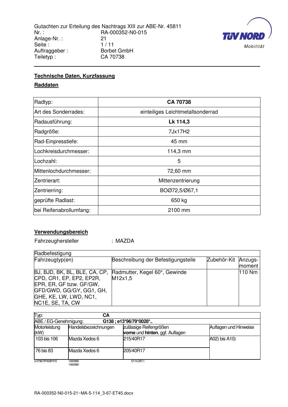 • Stimmt die KBA-Nummer auf der Felge mit diesem Dokument überein?