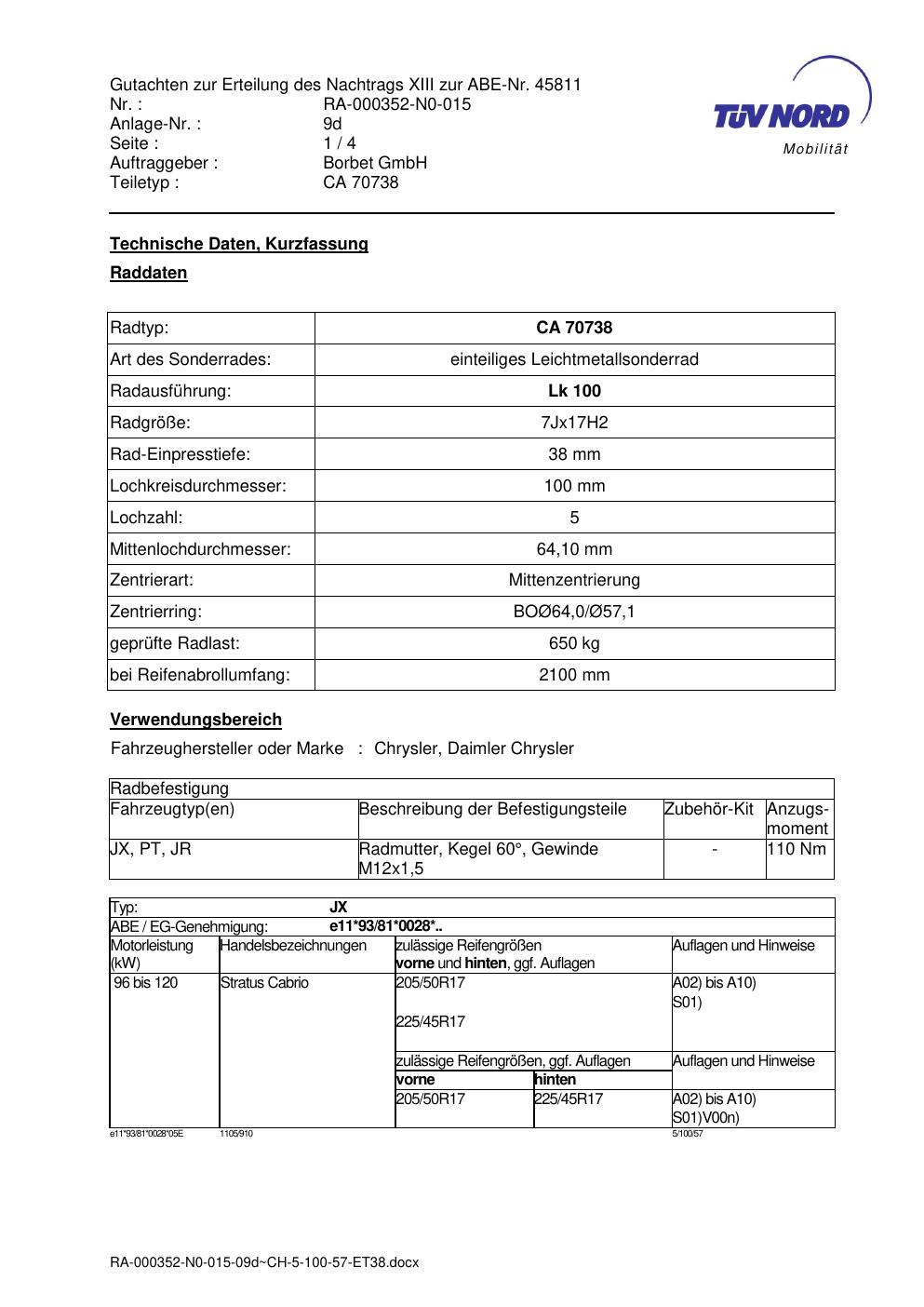 Dieses Gutachten (abe) bezieht sich auf die Alufelge Borbet CA 70738 in der Ausführung 7Jx17 ET 0, Mittenloch 0 mm (KBA 45811). Im PDF findest du typischerweise zulässige Reifengrößen, Auflagen/Anbauhinweise und – je nach Dokument – Hinweise zur Eintragung.