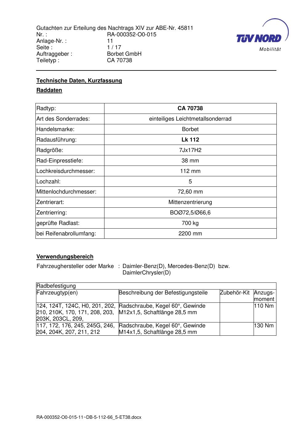 Dieses Gutachten (abe) bezieht sich auf die Alufelge Borbet CA 70738 in der Ausführung 7Jx17 ET 0, Mittenloch 0 mm (KBA 45811). Im PDF findest du typischerweise zulässige Reifengrößen, Auflagen/Anbauhinweise und – je nach Dokument – Hinweise zur Eintragung.