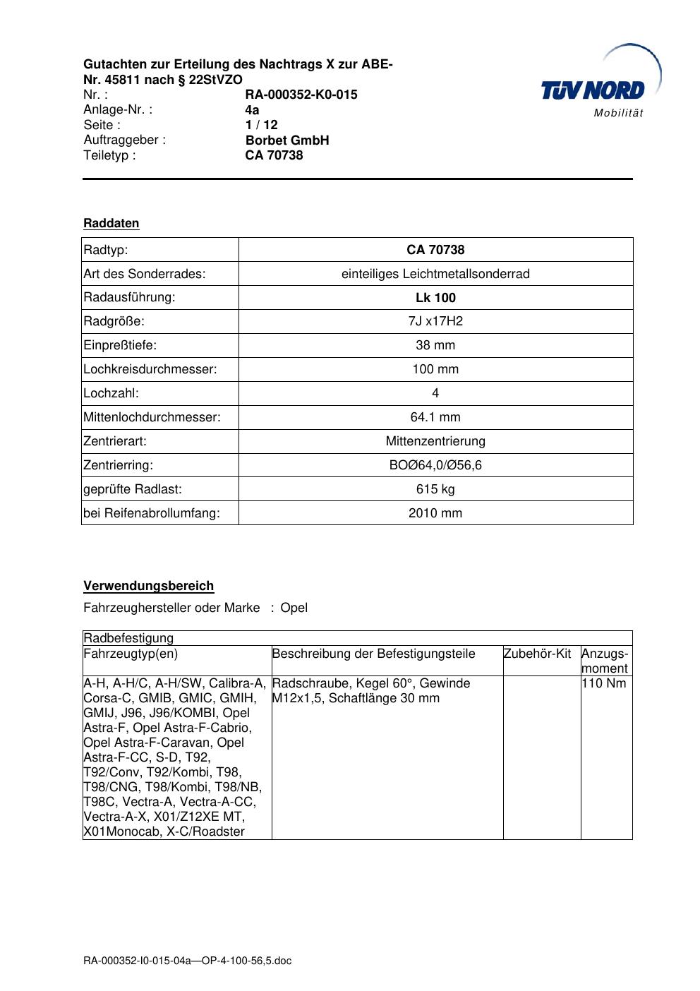 Dieses Gutachten (abe) bezieht sich auf die Alufelge Borbet CA 70738 in der Ausführung 7Jx17 ET 0, Mittenloch 0 mm (KBA 45811). Im PDF findest du typischerweise zulässige Reifengrößen, Auflagen/Anbauhinweise und – je nach Dokument – Hinweise zur Eintragung.
