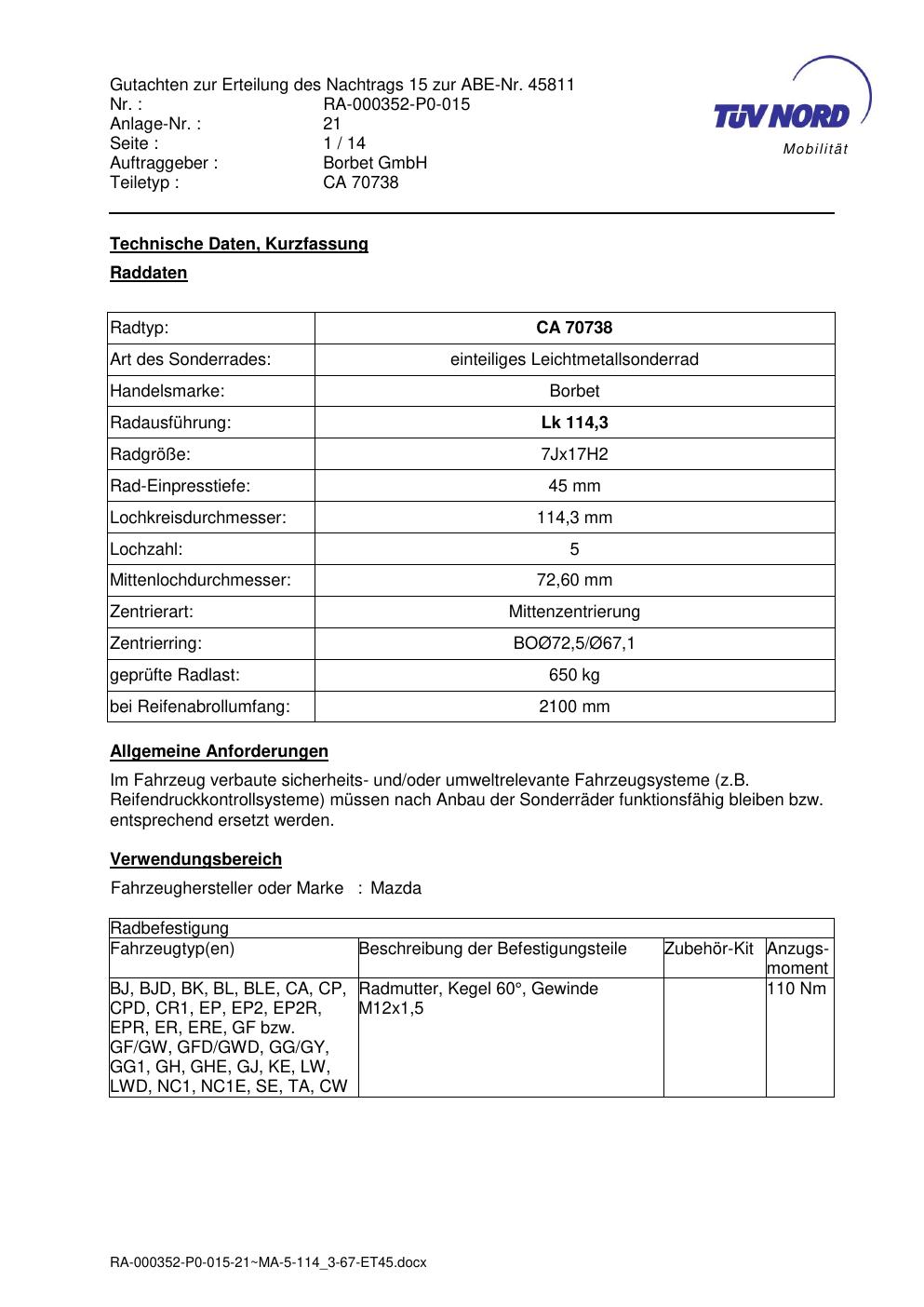 Dieses Gutachten (abe) bezieht sich auf die Alufelge Borbet CA 70738 in der Ausführung 7Jx17 ET 0, Mittenloch 0 mm (KBA 45811). Im PDF findest du typischerweise zulässige Reifengrößen, Auflagen/Anbauhinweise und – je nach Dokument – Hinweise zur Eintragung.