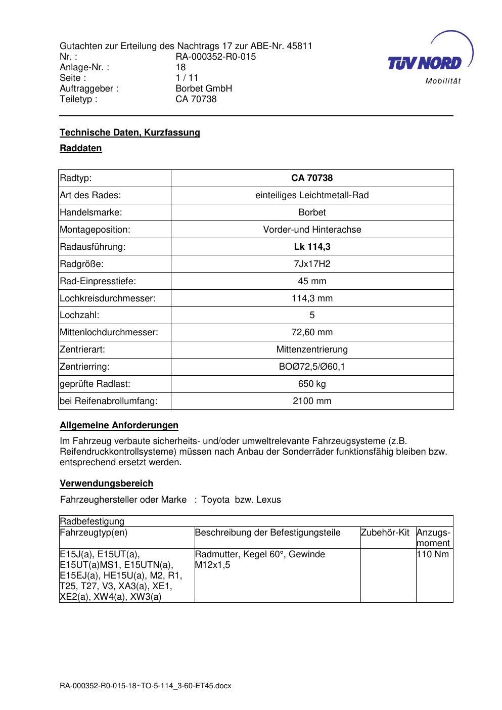 Dieses abe gehört zur Felge Borbet CA 70738 in 7Jx17 ET0 mit KBA 45811. Die Seite ist dafür gedacht, dass du schnell prüfen kannst, ob KBA, Design und Größe zu deiner Felge passen und danach direkt das richtige PDF lädst.