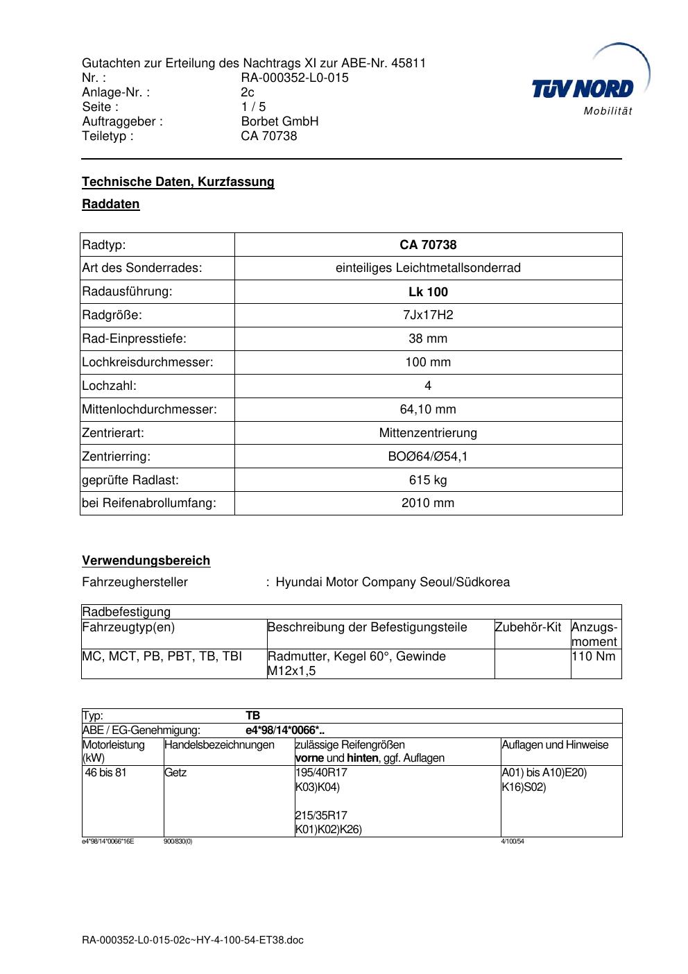 Dieses Gutachten (abe) bezieht sich auf die Alufelge brand-borbet CA 70738 in der Ausführung 7Jx17 ET 0, Mittenloch 0 mm (KBA 45811). Im PDF findest du typischerweise zulässige Reifengrößen, Auflagen/Anbauhinweise und – je nach Dokument – Hinweise zur Eintragung.