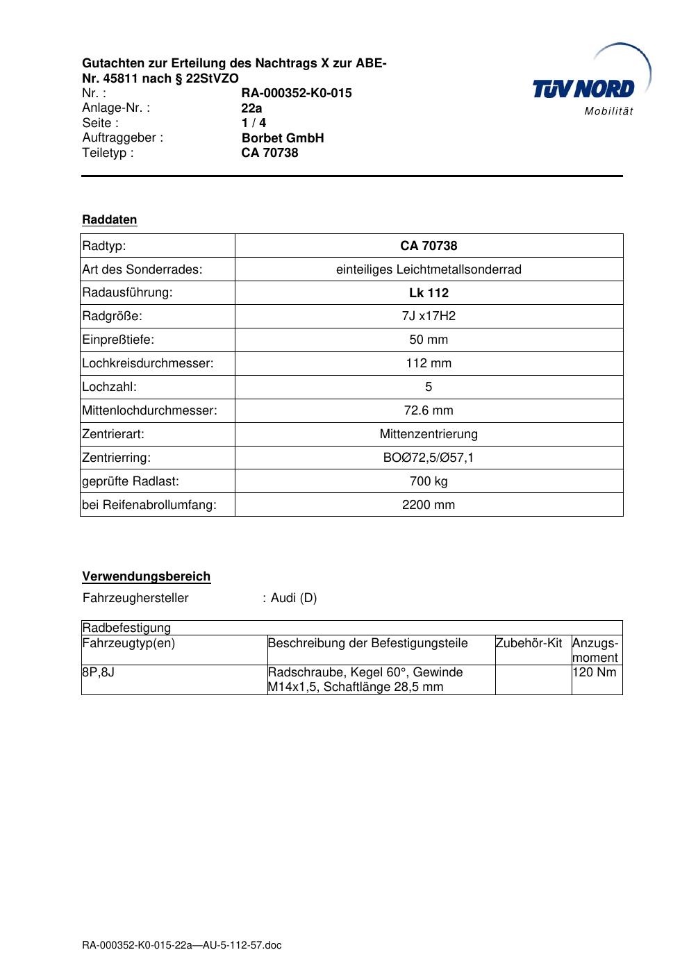 Dieses Gutachten (abe) bezieht sich auf die Alufelge Borbet CA 70738 in der Ausführung 7Jx17 ET 0, Mittenloch 0 mm (KBA 45811). Im PDF findest du typischerweise zulässige Reifengrößen, Auflagen/Anbauhinweise und – je nach Dokument – Hinweise zur Eintragung.
