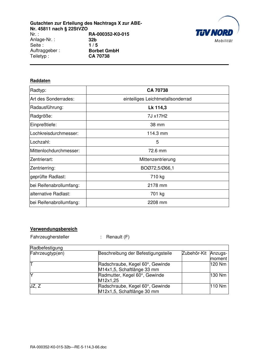 Dieses Gutachten (abe) bezieht sich auf die Alufelge Borbet CA 70738 in der Ausführung 7Jx17 ET 0, Mittenloch 0 mm (KBA 45811). Im PDF findest du typischerweise zulässige Reifengrößen, Auflagen/Anbauhinweise und – je nach Dokument – Hinweise zur Eintragung.