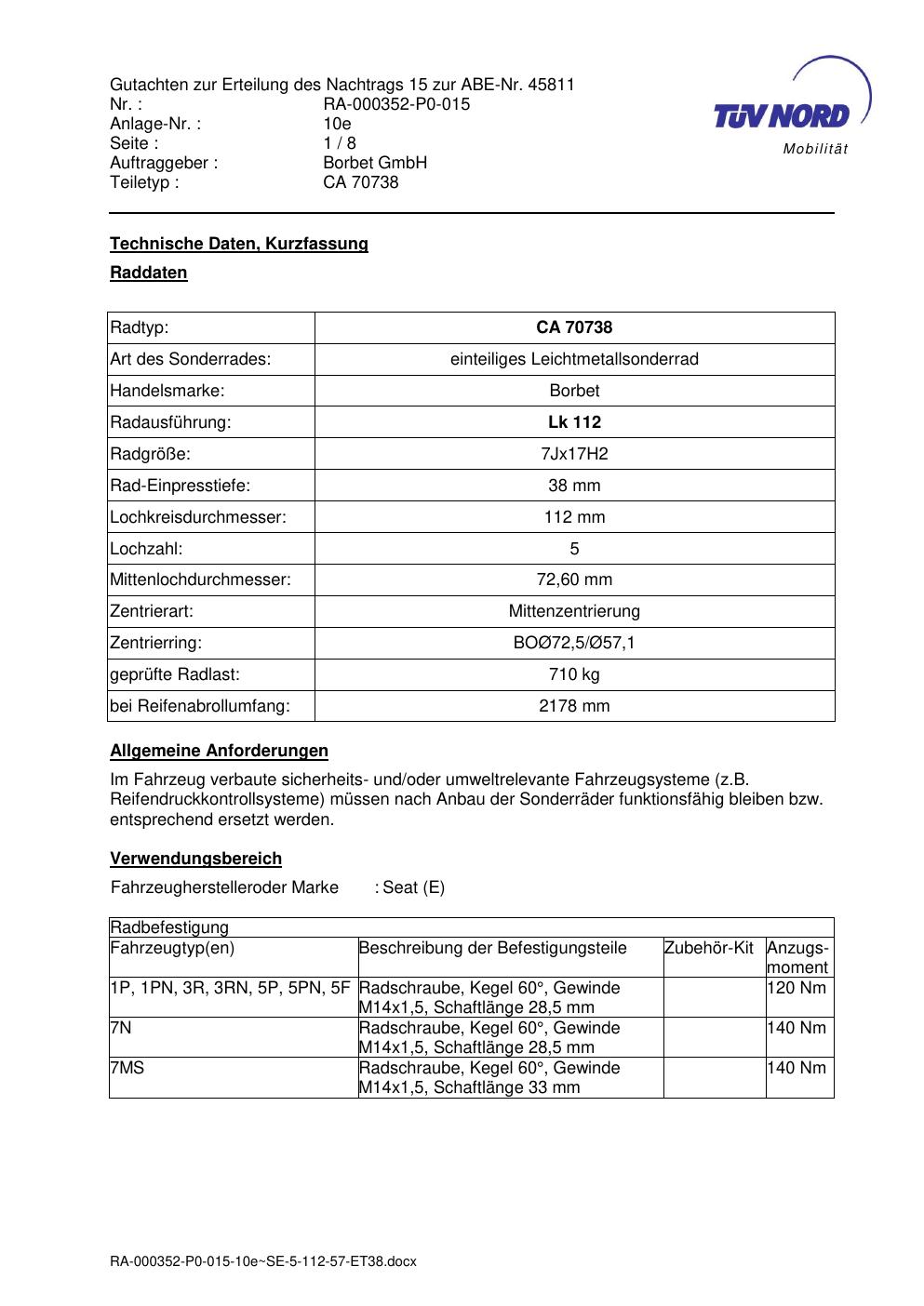 Dieses Gutachten (abe) bezieht sich auf die Alufelge Borbet CA 70738 in der Ausführung 7Jx17 ET 0, Mittenloch 0 mm (KBA 45811). Im PDF findest du typischerweise zulässige Reifengrößen, Auflagen/Anbauhinweise und – je nach Dokument – Hinweise zur Eintragung.