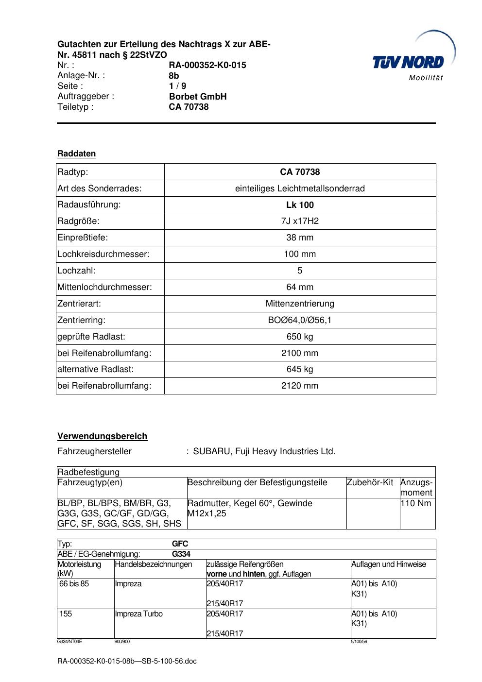 Dieses Gutachten (abe) bezieht sich auf die Alufelge Borbet CA 70738 in der Ausführung 7Jx17 ET 0, Mittenloch 0 mm (KBA 45811). Im PDF findest du typischerweise zulässige Reifengrößen, Auflagen/Anbauhinweise und – je nach Dokument – Hinweise zur Eintragung.