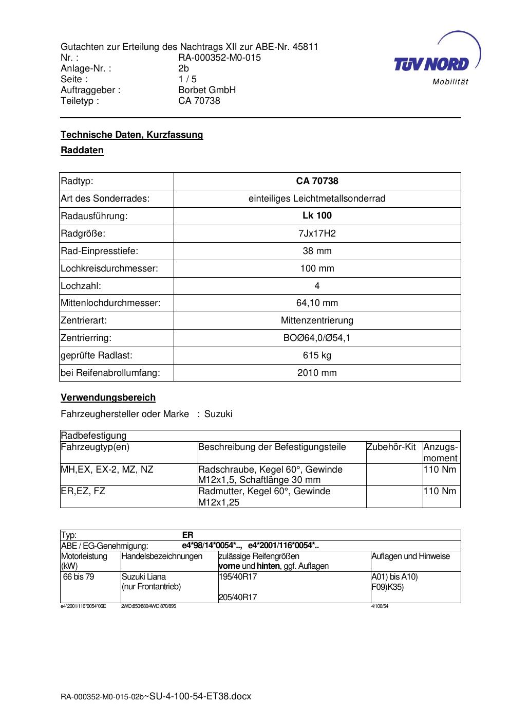 Dieses Gutachten (abe) bezieht sich auf die Alufelge Borbet CA 70738 in der Ausführung 7Jx17 ET 0, Mittenloch 0 mm (KBA 45811). Im PDF findest du typischerweise zulässige Reifengrößen, Auflagen/Anbauhinweise und – je nach Dokument – Hinweise zur Eintragung.