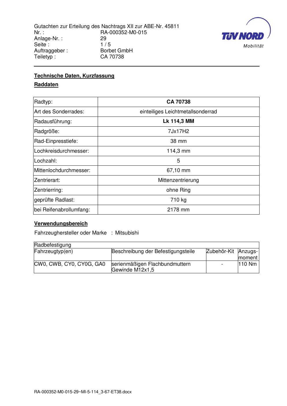 Dieses Gutachten (abe) bezieht sich auf die Alufelge Borbet CA 70738 in der Ausführung 7Jx17 ET 0, Mittenloch 0 mm (KBA 45811). Im PDF findest du typischerweise zulässige Reifengrößen, Auflagen/Anbauhinweise und – je nach Dokument – Hinweise zur Eintragung.