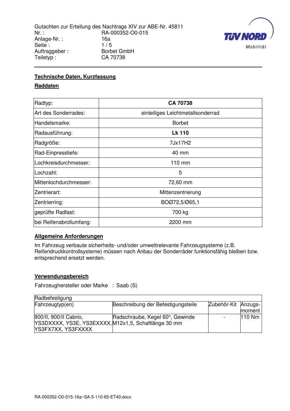 Dieses Gutachten (abe) bezieht sich auf die Alufelge brand-borbet CA 70738 in der Ausführung 7Jx17 ET 0, Mittenloch 0 mm (KBA 45811). Im PDF findest du typischerweise zulässige Reifengrößen, Auflagen/Anbauhinweise und – je nach Dokument – Hinweise zur Eintragung.
