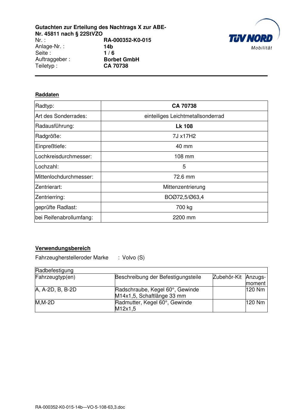 Dieses Gutachten (abe) bezieht sich auf die Alufelge Borbet CA 70738 in der Ausführung 7Jx17 ET 0, Mittenloch 0 mm (KBA 45811). Im PDF findest du typischerweise zulässige Reifengrößen, Auflagen/Anbauhinweise und – je nach Dokument – Hinweise zur Eintragung.