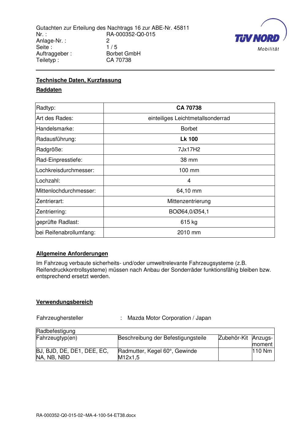 Dieses Gutachten (abe) bezieht sich auf die Alufelge Borbet CA 70738 in der Ausführung 7Jx17 ET 0, Mittenloch 0 mm (KBA 45811). Im PDF findest du typischerweise zulässige Reifengrößen, Auflagen/Anbauhinweise und – je nach Dokument – Hinweise zur Eintragung.