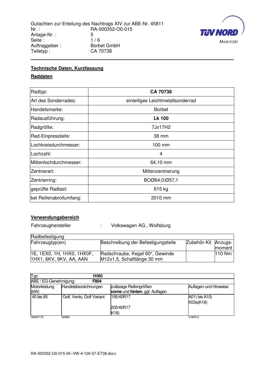 Dieses Gutachten (abe) bezieht sich auf die Alufelge Borbet CA 70738 in der Ausführung 7Jx17 ET 0, Mittenloch 0 mm (KBA 45811). Im PDF findest du typischerweise zulässige Reifengrößen, Auflagen/Anbauhinweise und – je nach Dokument – Hinweise zur Eintragung.