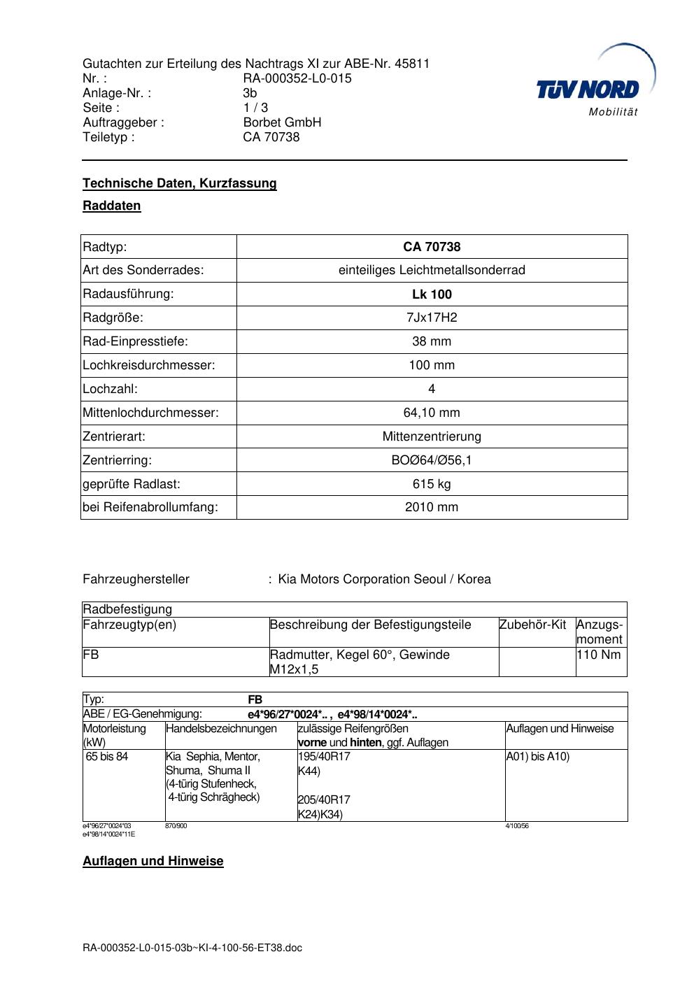 Dieses Gutachten (abe) bezieht sich auf die Alufelge Borbet CA 70738 in der Ausführung 7Jx17 ET 0, Mittenloch 0 mm (KBA 45811). Im PDF findest du typischerweise zulässige Reifengrößen, Auflagen/Anbauhinweise und – je nach Dokument – Hinweise zur Eintragung.