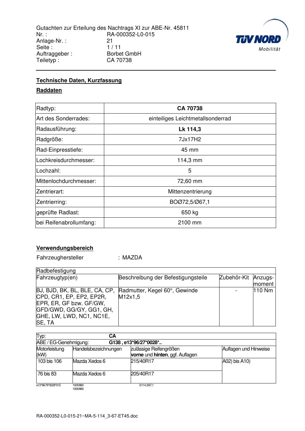 Dieses Gutachten (abe) bezieht sich auf die Alufelge Borbet CA 70738 in der Ausführung 7Jx17 ET 0, Mittenloch 0 mm (KBA 45811). Im PDF findest du typischerweise zulässige Reifengrößen, Auflagen/Anbauhinweise und – je nach Dokument – Hinweise zur Eintragung.