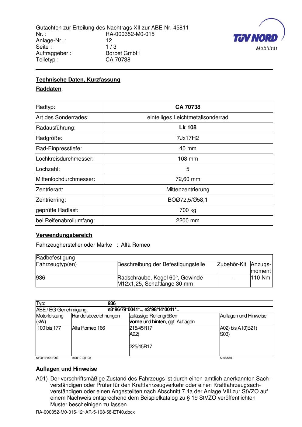 Dieses Gutachten (abe) bezieht sich auf die Alufelge Borbet CA 70738 in der Ausführung 7Jx17 ET 0, Mittenloch 0 mm (KBA 45811). Im PDF findest du typischerweise zulässige Reifengrößen, Auflagen/Anbauhinweise und – je nach Dokument – Hinweise zur Eintragung.