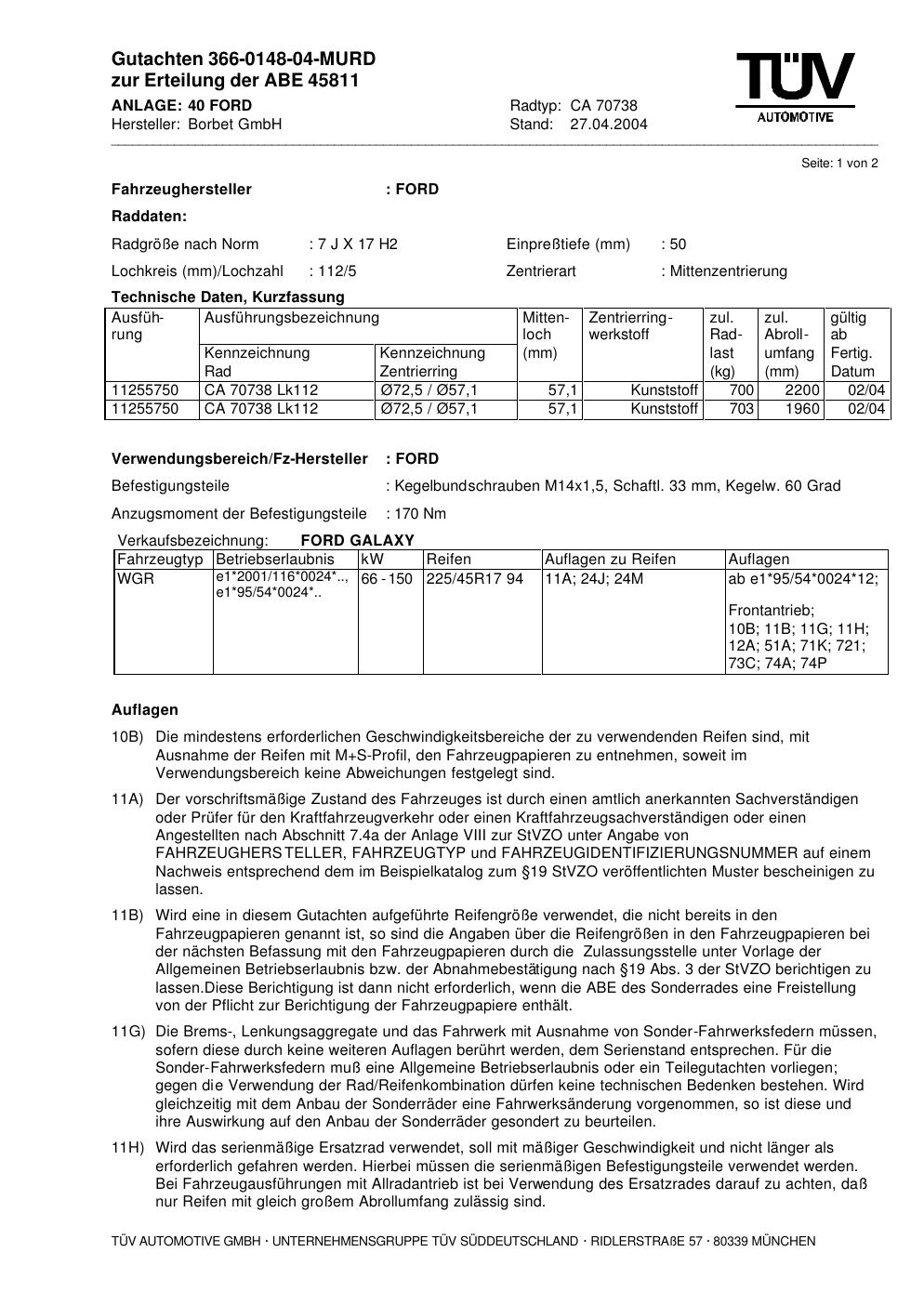 Dieses Gutachten (abe) bezieht sich auf die Alufelge brand-borbet CA 70738 in der Ausführung 7Jx17 ET 0, Mittenloch 0 mm (KBA 45811). Im PDF findest du typischerweise zulässige Reifengrößen, Auflagen/Anbauhinweise und – je nach Dokument – Hinweise zur Eintragung.