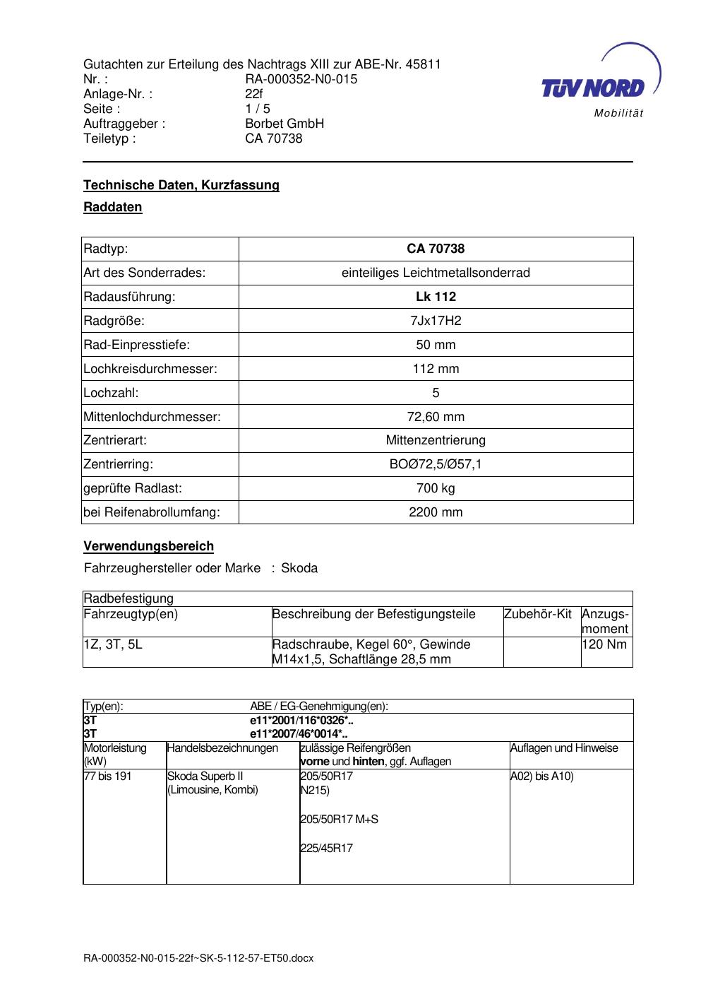 Dieses Gutachten (abe) bezieht sich auf die Alufelge Borbet CA 70738 in der Ausführung 7Jx17 ET 0, Mittenloch 0 mm (KBA 45811). Im PDF findest du typischerweise zulässige Reifengrößen, Auflagen/Anbauhinweise und – je nach Dokument – Hinweise zur Eintragung.