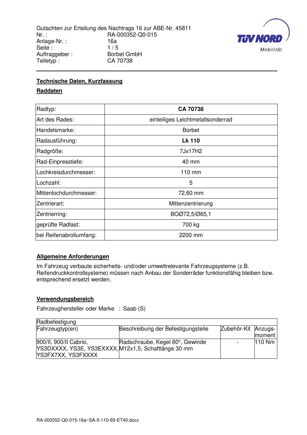 Dieses Gutachten (abe) bezieht sich auf die Alufelge Borbet CA 70738 in der Ausführung 7Jx17 ET 0, Mittenloch 0 mm (KBA 45811). Im PDF findest du typischerweise zulässige Reifengrößen, Auflagen/Anbauhinweise und – je nach Dokument – Hinweise zur Eintragung.