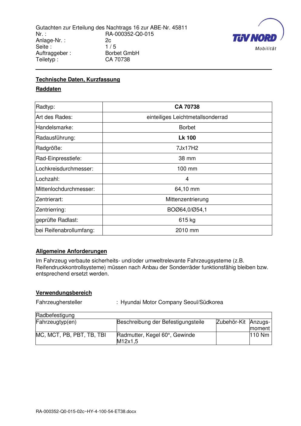 Dieses Gutachten (abe) bezieht sich auf die Alufelge Borbet CA 70738 in der Ausführung 7Jx17 ET 0, Mittenloch 0 mm (KBA 45811). Im PDF findest du typischerweise zulässige Reifengrößen, Auflagen/Anbauhinweise und – je nach Dokument – Hinweise zur Eintragung.
