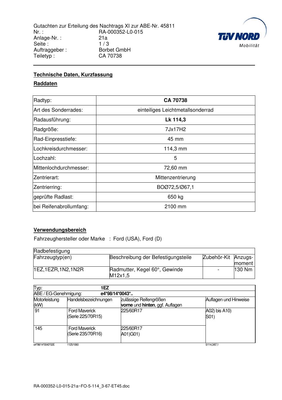 Dieses Gutachten (abe) bezieht sich auf die Alufelge Borbet CA 70738 in der Ausführung 7Jx17 ET 0, Mittenloch 0 mm (KBA 45811). Im PDF findest du typischerweise zulässige Reifengrößen, Auflagen/Anbauhinweise und – je nach Dokument – Hinweise zur Eintragung.