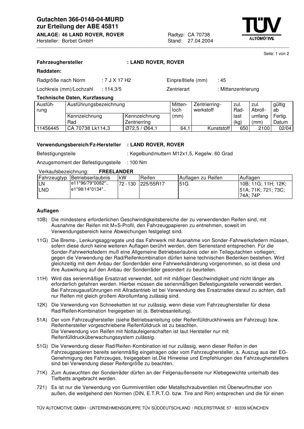 Dieses Gutachten (abe) bezieht sich auf die Alufelge Borbet CA 70738 in der Ausführung 7Jx17 ET 0, Mittenloch 0 mm (KBA 45811). Im PDF findest du typischerweise zulässige Reifengrößen, Auflagen/Anbauhinweise und – je nach Dokument – Hinweise zur Eintragung.