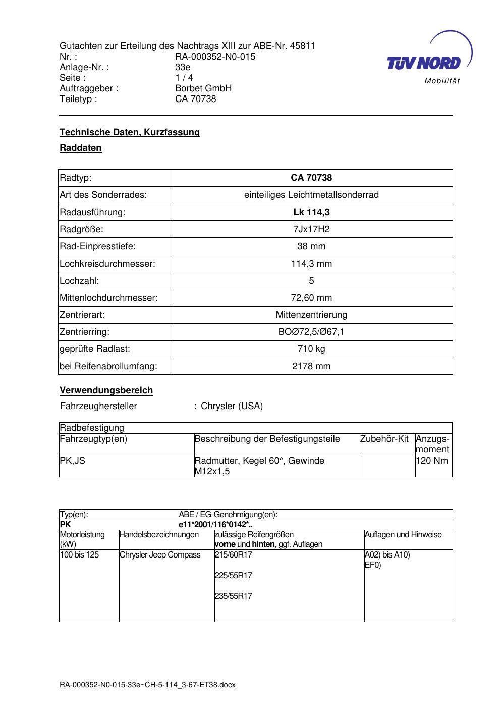 Dieses Gutachten (abe) bezieht sich auf die Alufelge brand-borbet CA 70738 in der Ausführung 7Jx17 ET 0, Mittenloch 0 mm (KBA 45811). Im PDF findest du typischerweise zulässige Reifengrößen, Auflagen/Anbauhinweise und – je nach Dokument – Hinweise zur Eintragung.