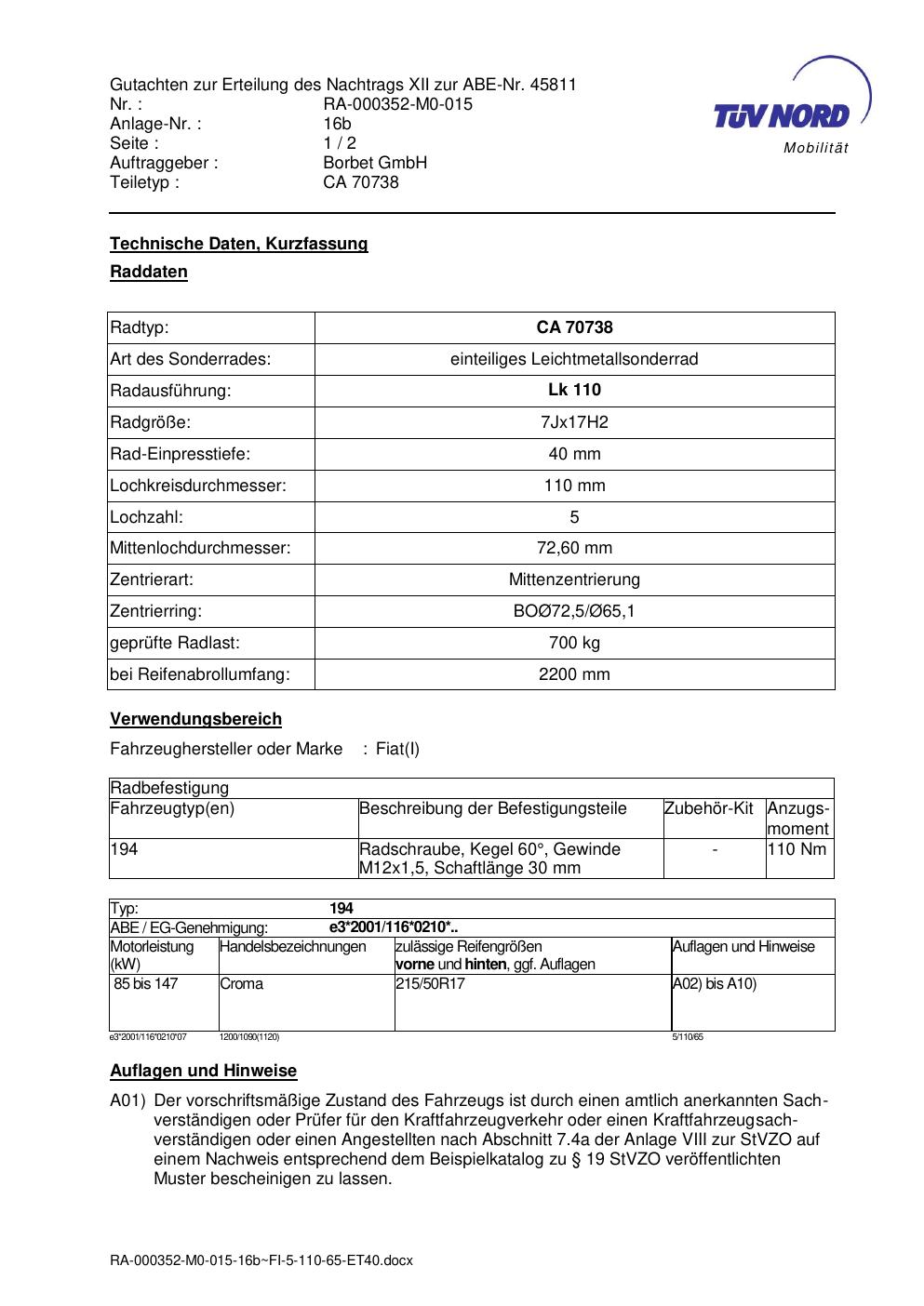 Dieses Gutachten (abe) bezieht sich auf die Alufelge Borbet CA 70738 in der Ausführung 7Jx17 ET 0, Mittenloch 0 mm (KBA 45811). Im PDF findest du typischerweise zulässige Reifengrößen, Auflagen/Anbauhinweise und – je nach Dokument – Hinweise zur Eintragung.